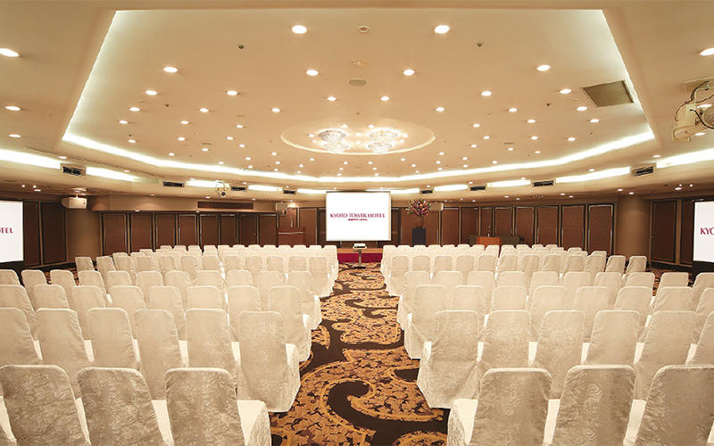着席スタイルで200名様、立食パーティーでは最大250名様までお迎えできる大宴会場「八閣」。フロア貸切による最大500名の立食パーティーも可能事から、大人数のお別れの会にも最適な空間です。 -